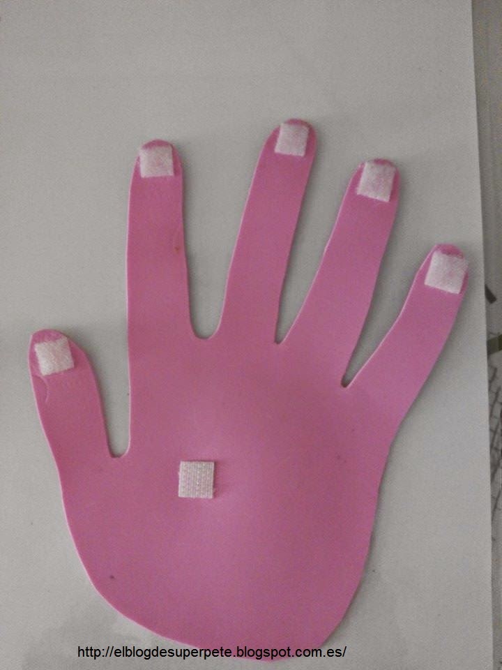 3) Una vez que están bien pegadas, hay que colocar trocitos de velcro (como si fueran uñas) en puntos estratégicos para que podamos ir "recogiendo" los dedos. Se coloca primero uno rugoso en la palma de la mano (mirad en la foto donde cae más o menos, aunque dependerá de lo largos que tengáis vuestros dedos, probad primero a recoger todos los dedos y ver en que punto se puede hacer).